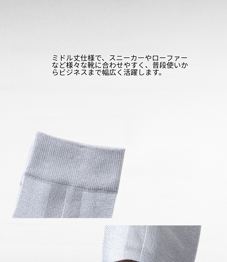 ● ミドル丈仕様で、スニーカーやローファーなど様々な靴に合わせやすく、普段使いからビジネスまで幅広く活躍します。