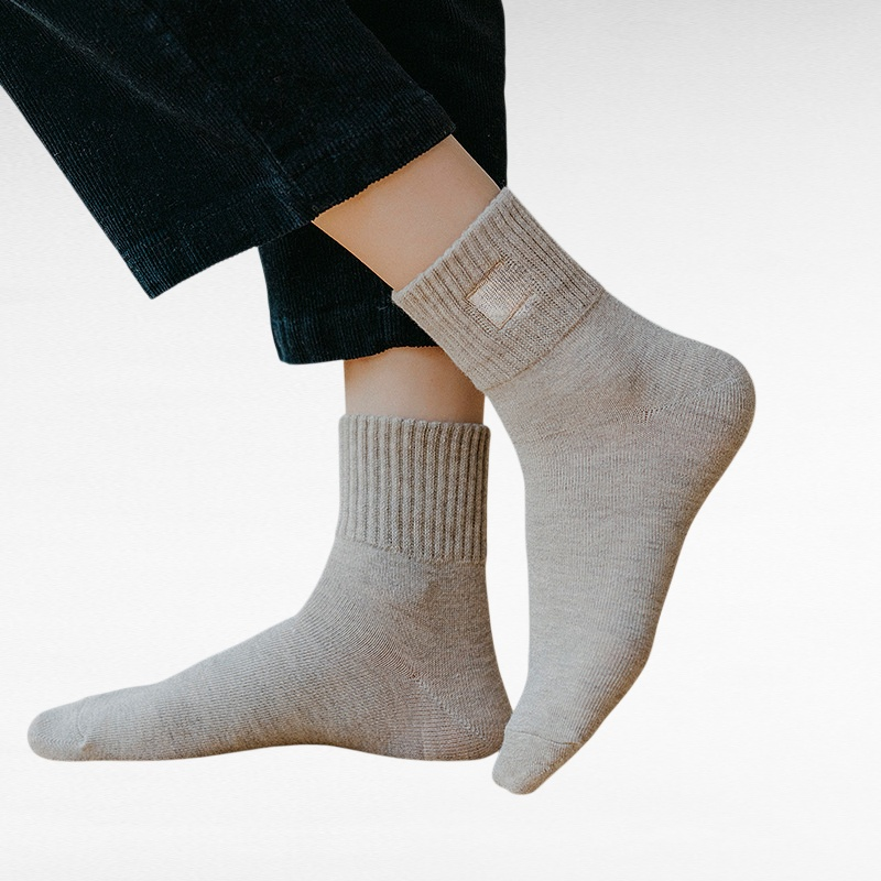 秋用レディースミドル丈ソックス・純色・スマイル刺繍・吸汗防臭