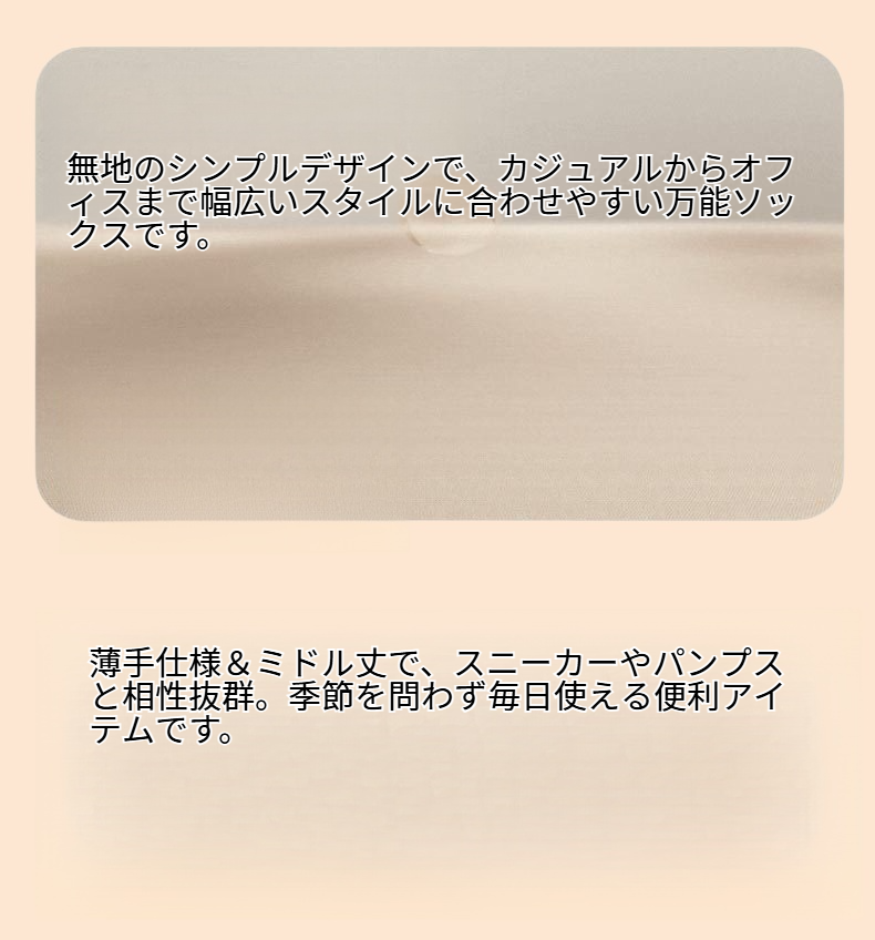 ● 薄手仕様&ミドル丈で、スニーカーやパンプスと相性抜群。季節を問わず毎日使える便利アイテムです。