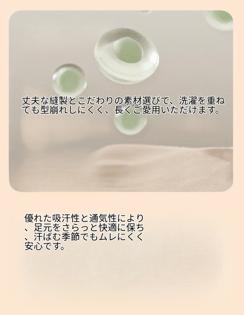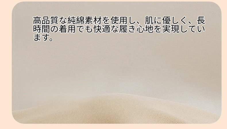 ● 高品質な純綿素材を使用し、肌に優しく、長時間の着用でも快適な履き心地を実現しています。